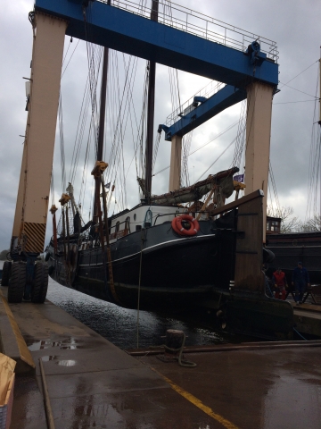 Dienstagmorgen 08-04-2014 wurde die Aagtje mit einem grossen fahrenden Kran aus dem Wasser gehoben.